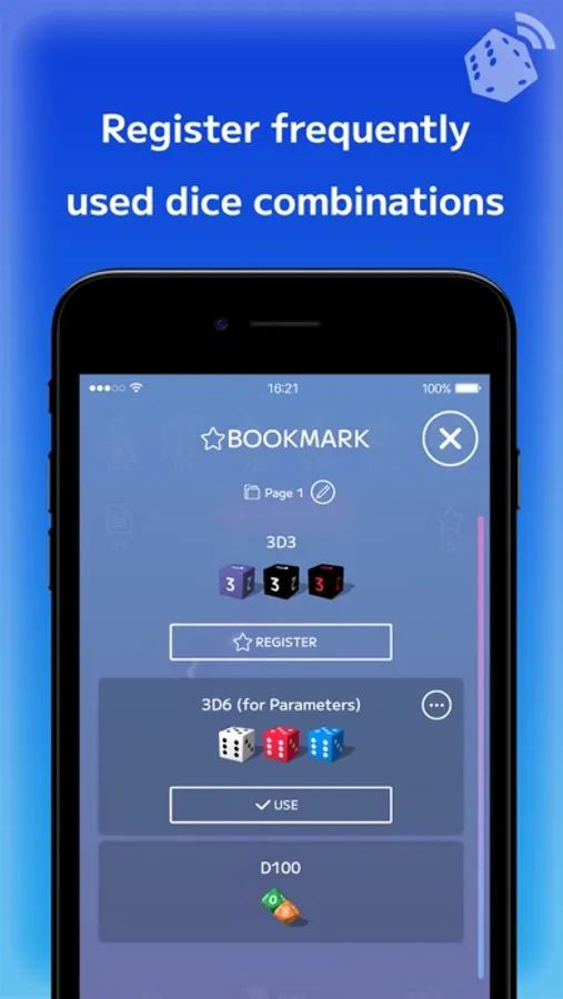 ● Bookmark: Register frequently used dice combinations. You can also name them.