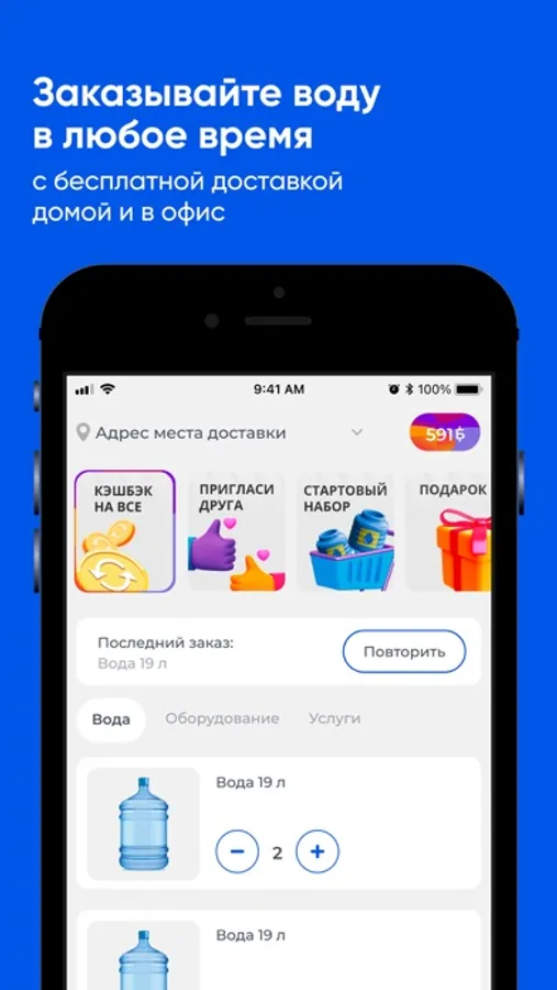 Заказать воду в приложении Компания "H2O" просто и быстро. Все товары собраны по категориям. Добавляйте нужные позиции в корзину и оформляйте заказ в любое время суток.
