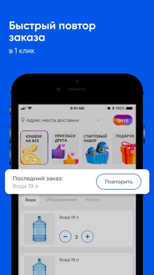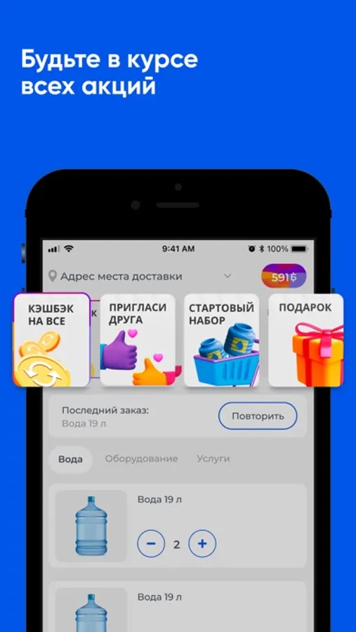 Скачайте приложение Компания "H2O" на свой смартфон и делайте заказ воды 24/7. Вы сможете повторять заказ нажатием одной кнопки, видеть всю историю покупок и быть в курсе всех акций компании.
