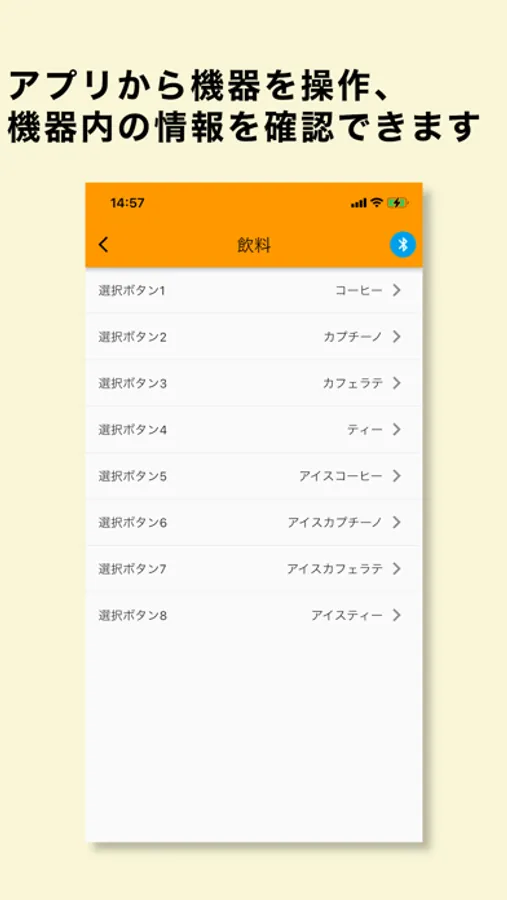 本アプリを使用することで、サンデン・リテールシステム株式会社が提供する「Mixta ARMO(コンパクトパウダーマシン)」を操作、設定することができます。従来の液晶表示のリモコンとは異なり、スマートフォンならではの多彩な表現を取り入れることで操作性を向上しました。