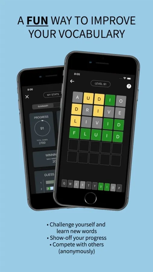 Enrich your vocabulary by playing this fun game. Vocably allows you to play multiple words in a day. Learn the meanings of new words, show off your progress to your friends, and compete against others in the world anonymously.