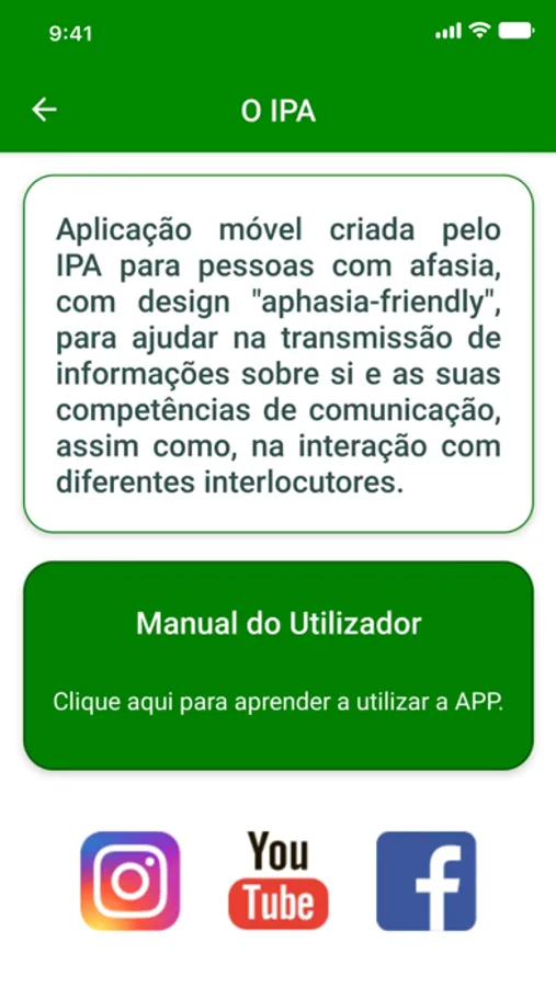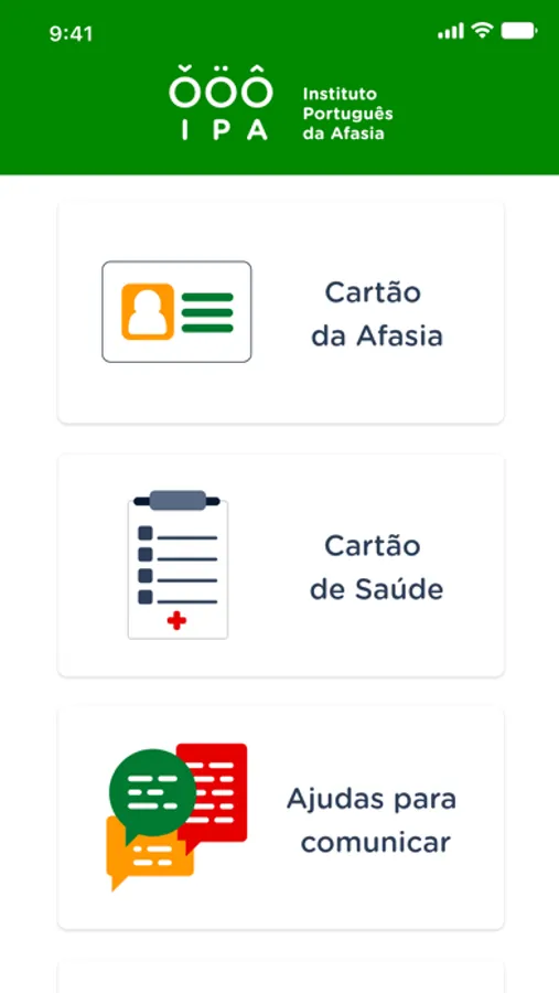 A aplicação foi desenvolvida em português, com design aphasia-friendly, que auxilia as PcA na transmissão de informações sobre si e sobre as suas competências de comunicação, assim como, facilita a sua interação com diferentes interlocutores. Os principais objetivos deste projeto passam pela facilitação do processo de comunicação, o aumento da participação social das PcA e, assim, reduzir o seu isolamento social.