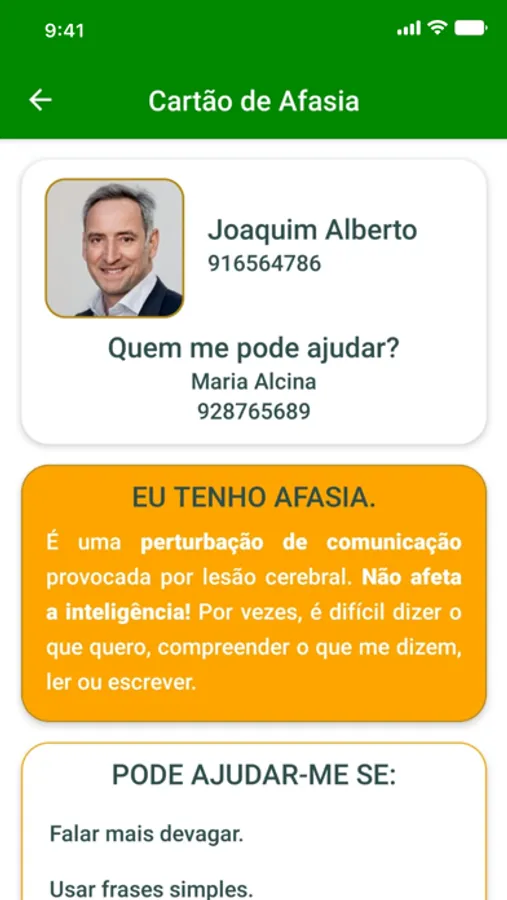 Disponibiliza um cartão de identificação personalizável, onde os interlocutores possam rapidamente saber o que é a afasia e como podem ajudar;