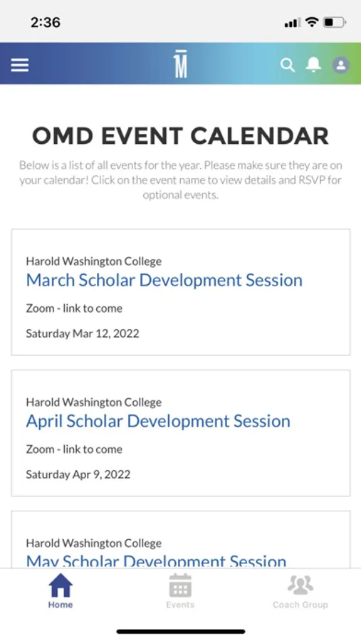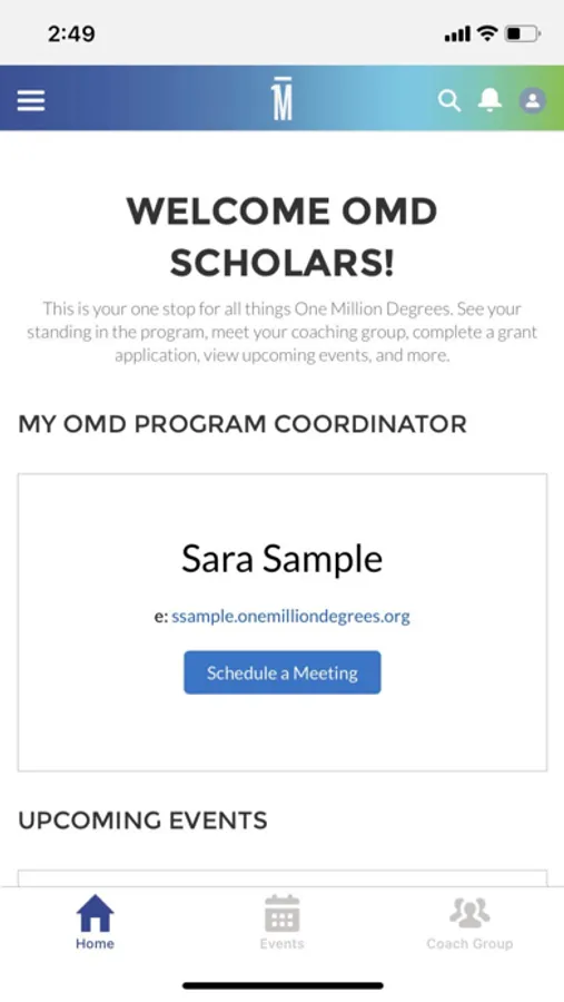 Coaches and scholars can view their coach group, upcoming events, and relevant resources. Scholars can use the app to apply for grants, access all payment records, view performance on evaluation rubrics, and more.