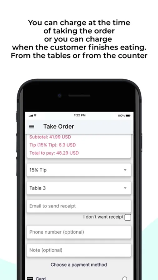 The waiters can charge at each table at the time of taking the order, for example: a crowded bar, the waiter asks for the amount charged and then delivers the drinks.