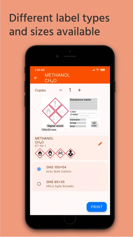 • Labels with hazard pictograms (compliant to GHS/CLP regulations) are available.
