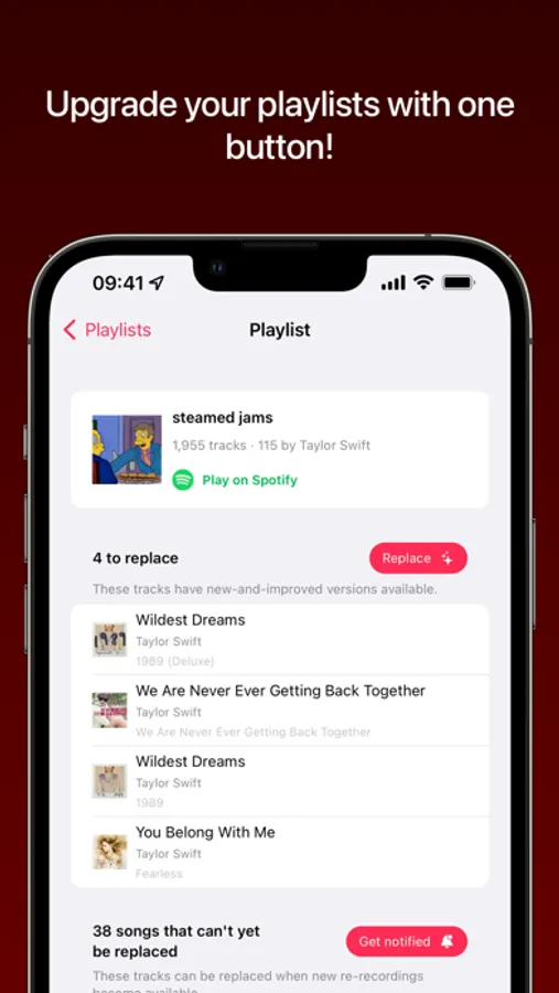 Taylor's Version helps you update Taylor Swift songs across your Spotify playlists to use the new, re-recorded versions.