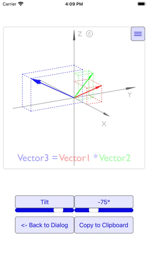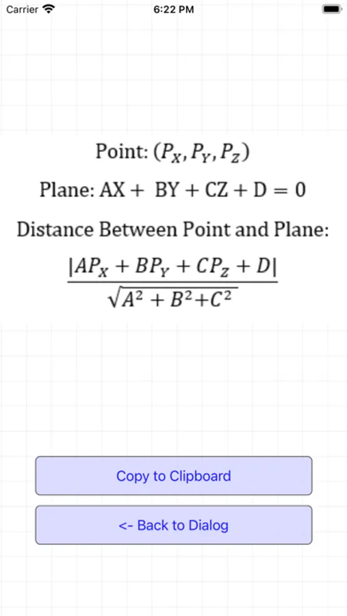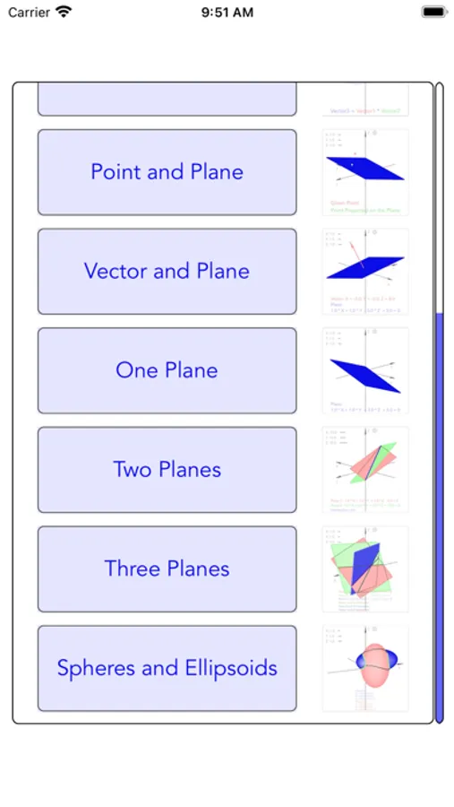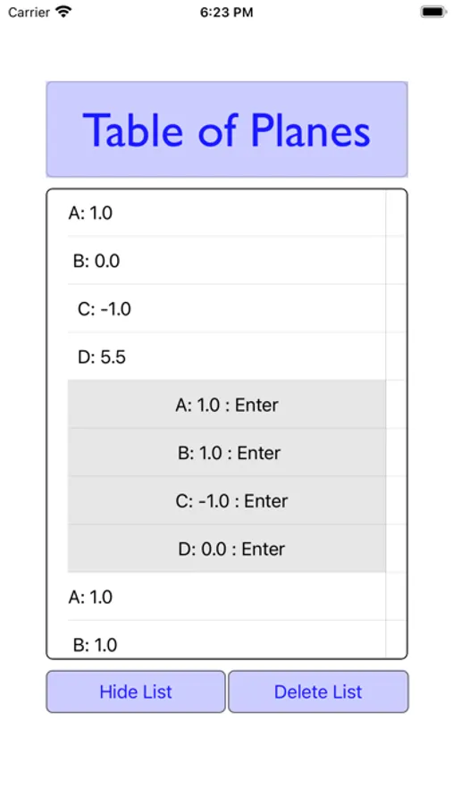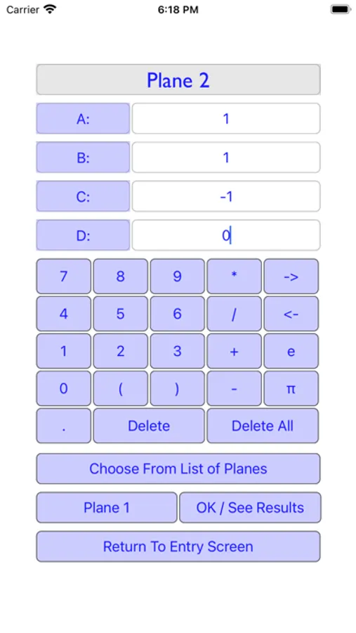 Previous entries for vectors, planes, and points are stored in a table and available after the app is closed.