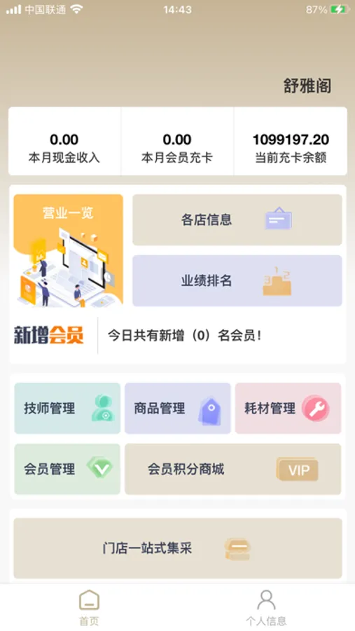 (1)店长可以直接查看门店的本月现金收入、本月会员充卡、当前充卡余额