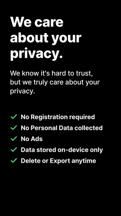 - Privacy: The data is stored on the device only, so you are the only one with access to your data.