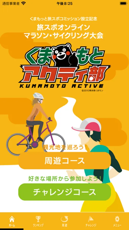 大会は「周遊コース」と「チャレンジコース」の2コースがあり、周遊コースは 熊本の観光地を巡ります。チャレンジコースは県内外を問わず好きな場所から参 加できます。大会期間中に各コースをクリアし、応募すると熊本の特産品が抽選 で当たります(タイムを競う必要はありません)。気軽に健康維持と熊本観光が 楽しめます。