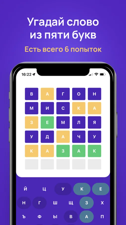 Покажи свою смекалку! Вам необходимо угадать слово за 6 попыток. Каждое слово должно быть длиной ровно 5 символов. После каждой попытки, цвета ячеек подскажут вам, верно ли угадана буква.
