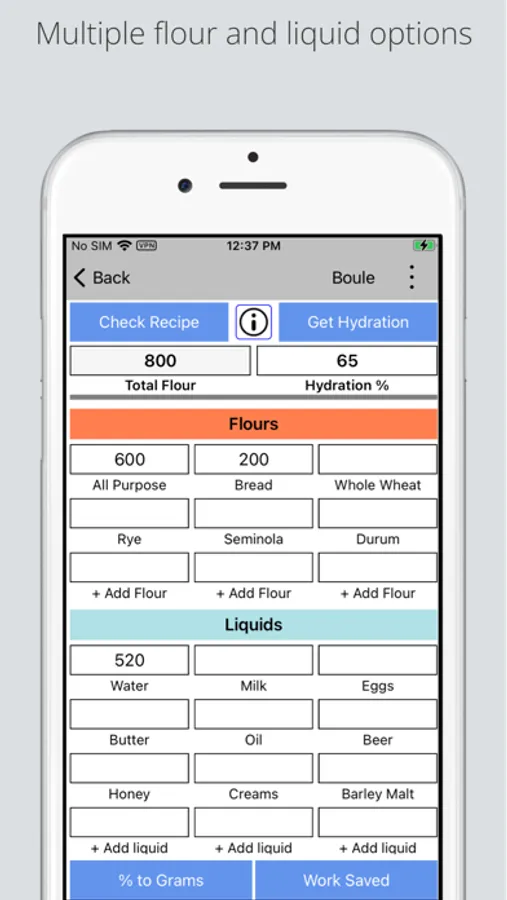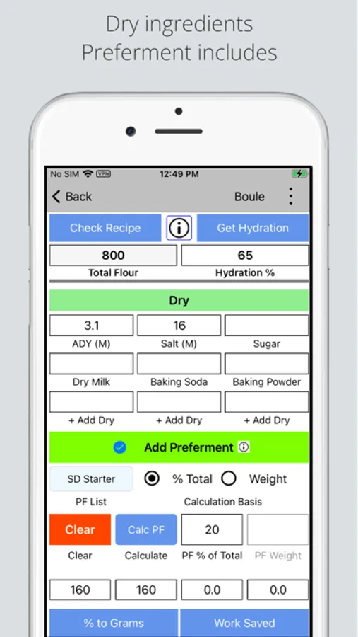 Easily add or remove a preferment from the recipe and the app will recalculate, keeping the total overall flour size and hydration % the same.