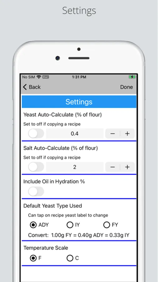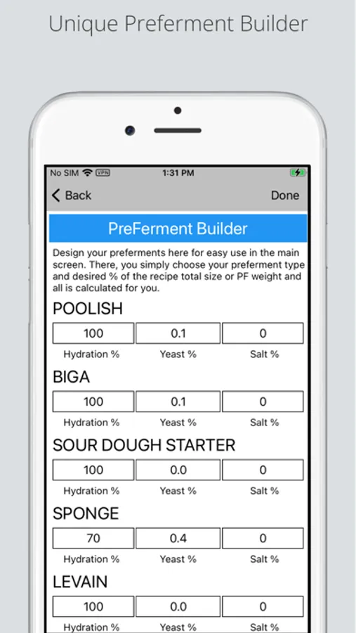 Design up to 7 preferments in advance. The app seamlessly uses your selected preferment's percents for hydration, yeast, and salt for all calculations.
