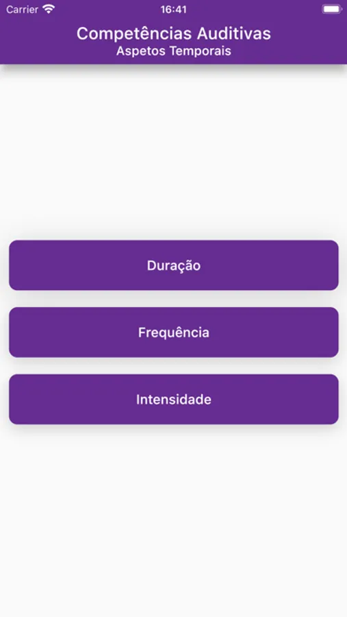 A aplicação Aspetos Temporais - Competências Auditivas é uma APP que contém 49 exercícios que se dividem em: 18 faixas que trabalham o aspeto temporal de duração; 24 faixas que trabalham o aspeto temporal de frequência; e 7 faixas que trabalham o aspeto temporal de intensidade. Esta APP foi realizada pelas terapeutas da fala Filipa Branco e Sara Araújo, sob a orientação da Professora Doutora Cristiane Lima Nunes, com o objetivo de desenvolver o Processamento Auditivo Central, mais especificamente a competência auditiva de discriminação e ordenação de aspetos temporais.