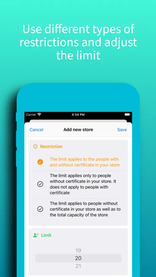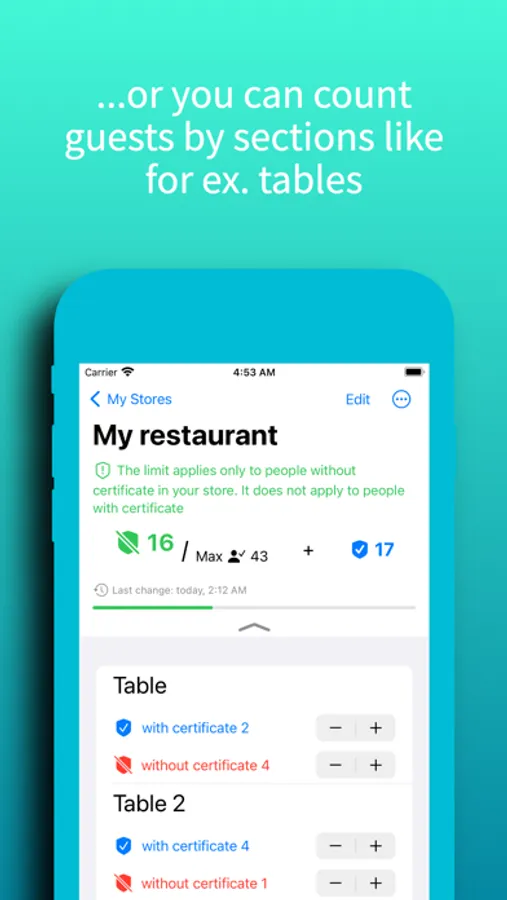 You can count people with distinction of guests who have certificates, permissions and those who haven’t. What's more, the app allows you to do it in user defined sections of your store such as tables, halls, rooms, etc. The feature is especially useful when working in a restaurant, café or small hotel. In smaller stores, such as, for example, shops, you can use a function of general counting without sections.