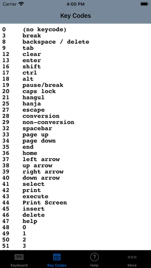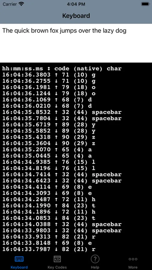 Simple debugging app for wired and bluetooth keyboards, page turners, and other external keyboards.