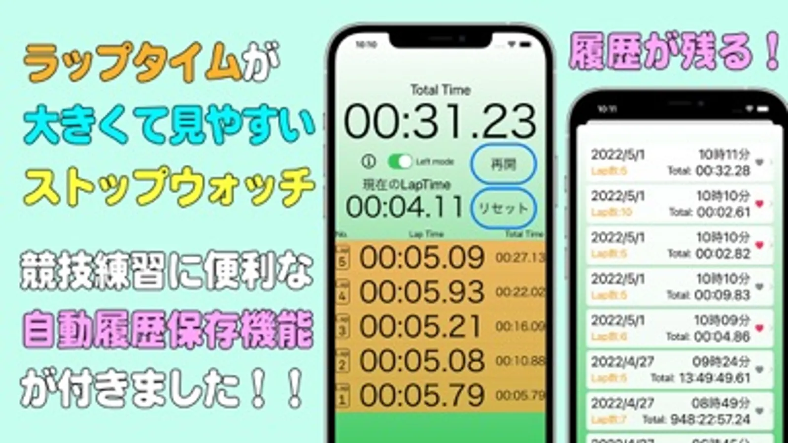 自動履歴保存機能&両利き対応の片手操作が可能な見やすいストップウォッチアプリです。