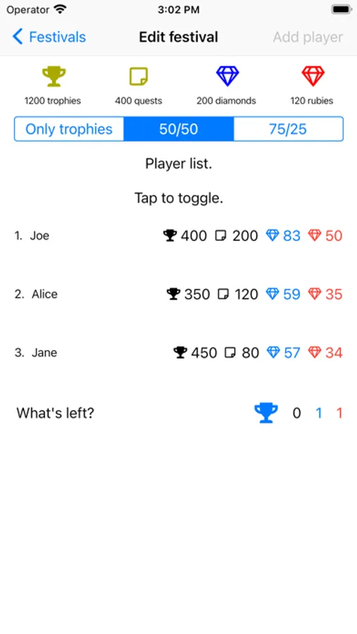 With this app you can easily calculate how many diamonds and rubies each player in your town should get, based only on the number of trophy points the player has collected (basic option), or based both on the number of trophy points earned and the number of completed tasks (options 50/50 and 75/25).