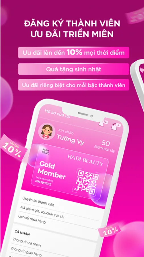 - Tạo tài khoản, tích điểm cho mỗi đơn hàng và nhận được các quyền lợi chỉ dành riêng cho khách hàng thành viên của Hadi Beauty.