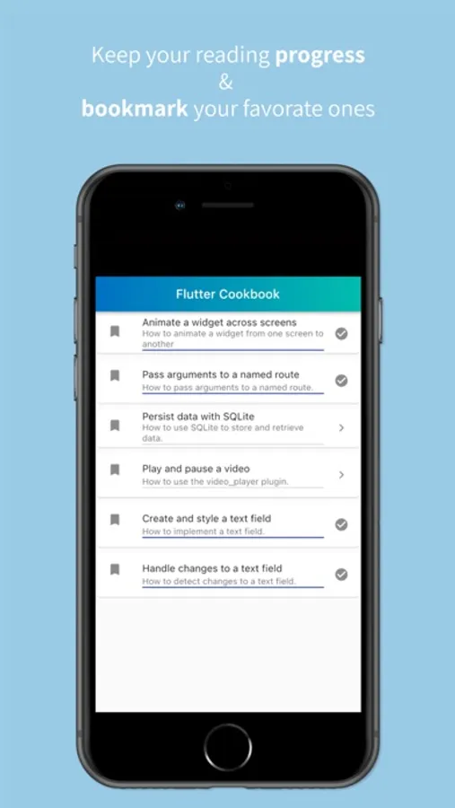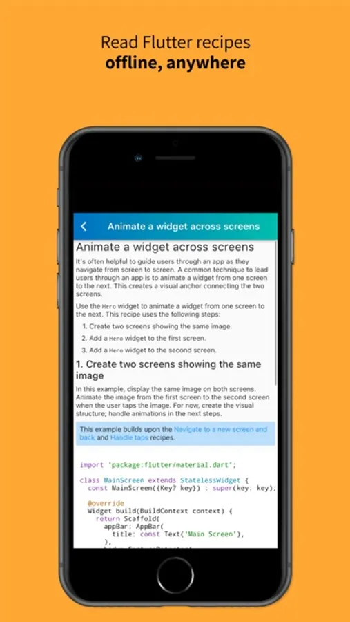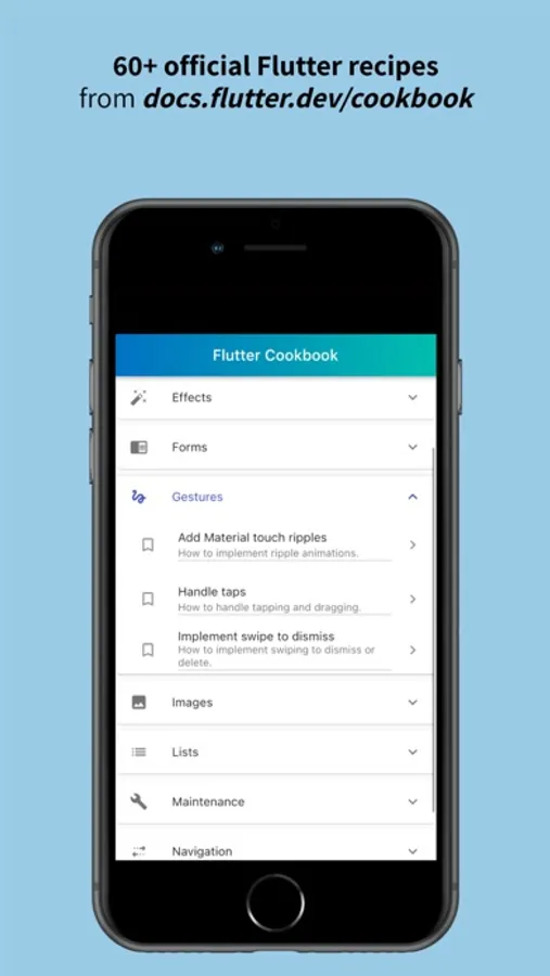 - 60+ official recipes from docs.flutter.dev/cookbook.