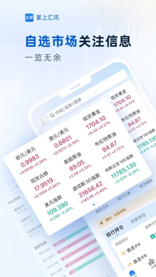 作为一款跨市场,移动终端覆盖,灵活专业的深度金融市场资讯与分析工具,掌上汇讯提供黄金、白银、外汇、主要国际指数与贵金属、英美原油、大宗商品等全球投资产品的实时行情数据、财经新闻、财经日历、持仓报告、经济指标、投机情绪、投行订单等,助力投资交易者更快更准地进行交易。