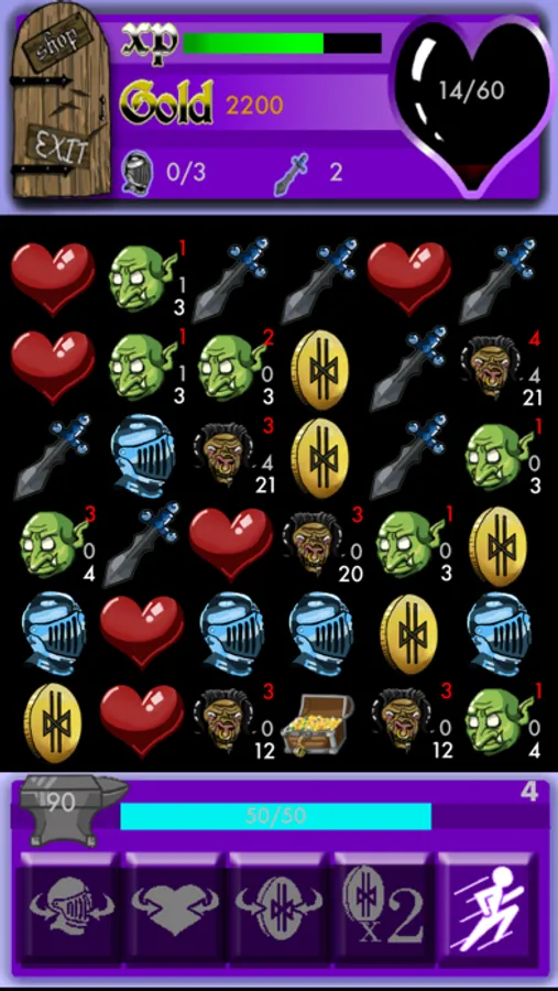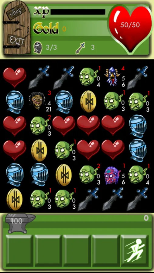 Match 3 tiles of similar type or more to attack, heal, repair, or collect gold in this match three style role playing game.