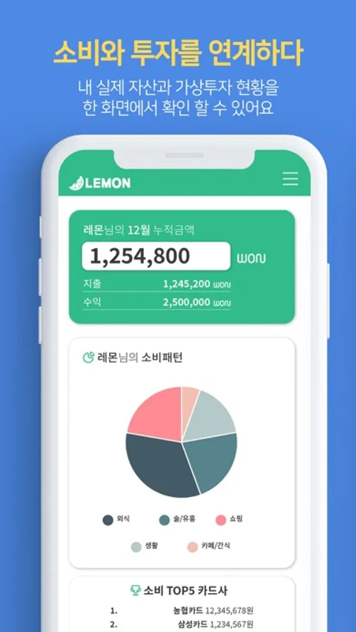 레몬과 함께 오늘의 내 소비패턴을 활용, 가상 투자 해봄으로서 오늘의 내 소비를 플러스의 관점에서 바라보세요.