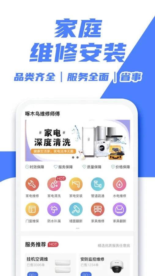 啄木鸟维修师傅是全国领先的一站式家庭维修服务APP,提供专业优质的高品质上门服务,服务项目涵盖家电维修、家电清洗、管道疏通、房屋修缮、水电维修、家电拆装、家具维保、厨卫改造、防水补漏等95+维保服务品类,平台致力于更便捷、更优惠、更放心、更专业的维修服务,业务覆盖2200+县及以上城市,拥有20万+优秀维修工程师,已累计为3000万用户提供上门维修服务,平台服务标准严格、价格透明,只需轻松预约,啄木鸟维修师傅,让服务更放心,让生活变得更美好。