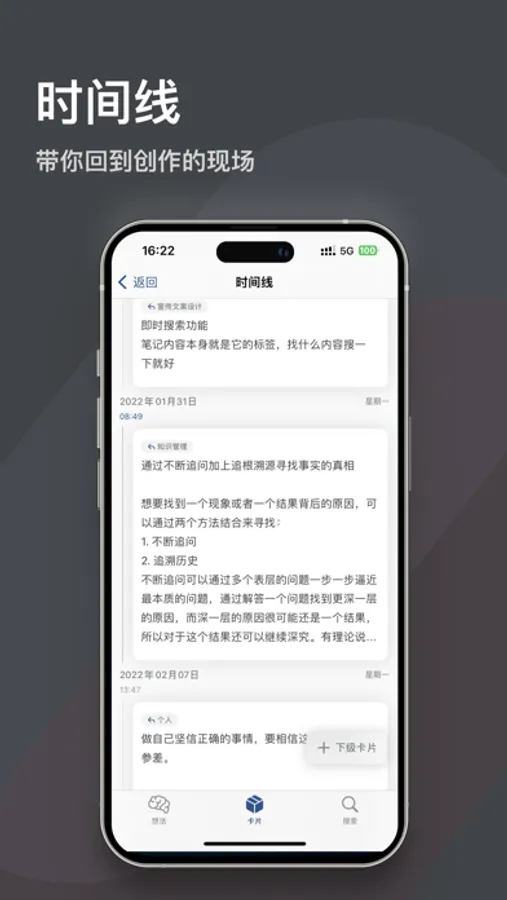 时间线则是一元化笔记的“灵魂”。奥野宣之发明的一元化笔记法主张所有内容按时间顺序都记录下来,这样在日后回顾时,还可以以时间维度浏览当时记笔记前后还记录的其他内容。很多时候我们的灵感并不是在使劲思考时产生的,反倒在不经意间,或因为其他某些事情联想而来的。zettebox提供了时间线功能,你可以快速在时间线中定位要查看的卡片,了解写下这张卡片前后几天还思考了什么。