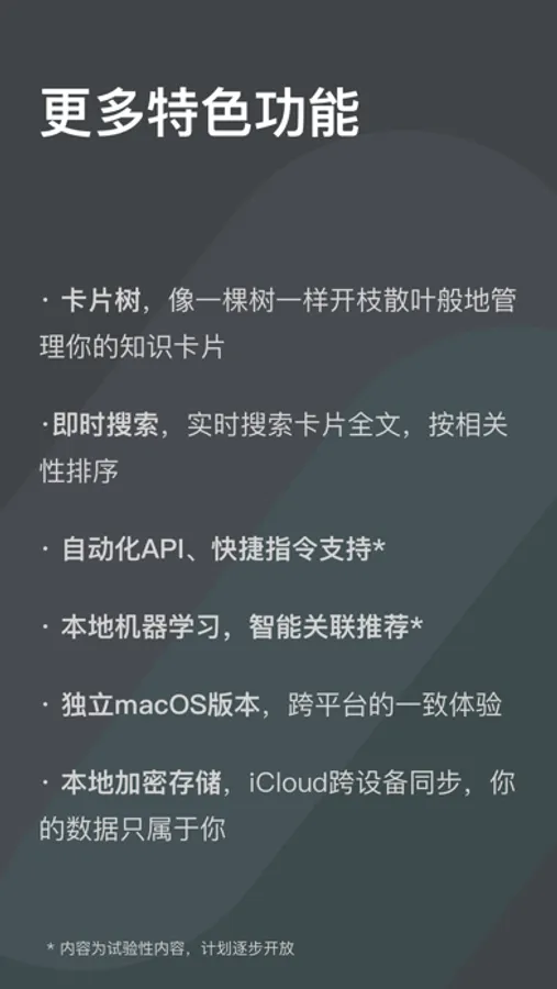 作为产品设计者和知识工作者。我深知对于知识管理工具而言,最重要的是稳定性和安全性。所以zettelbox从设计之初就坚持使用系统原生开发技术、坚持本地加密存储+云服务备份的方案。接下来还会提供更灵活的数据导出功能。同时我会承诺永久维护zettelbox这个产品,用时间来证明它的价值。