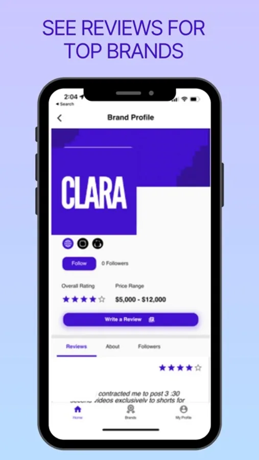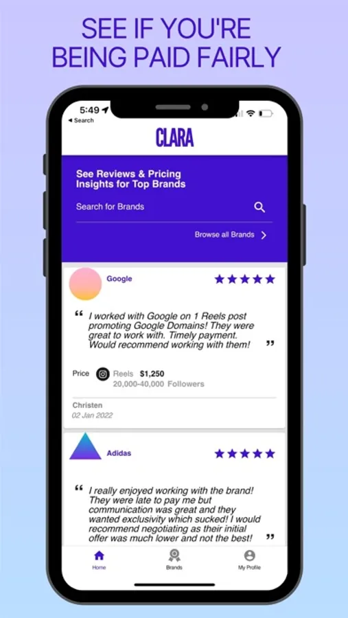 Clara is a community that empowers creators through transparency, brand reviews/ratings and discoverability. Clara enables creators to create profiles, and post details, reviews and insight on the brand deals they are involved in. Users can sort by profiles and reviews from relevant creators with similar attributes, follower size, etc