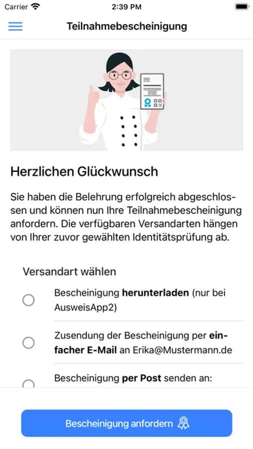 Ihre Teilnahmebescheinigung erhalten Sie in Abhängigkeit der von Ihnen gewählten Identifikationsmethode.