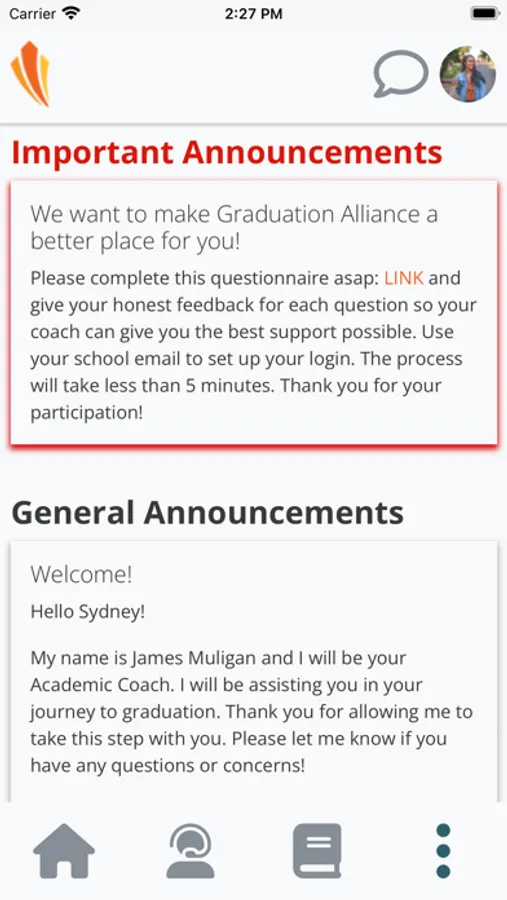 As a Graduation Alliance student, you can access your school portal to check class progress, get the latest updates, and chat with your support team. This app does not allow you to access assignments or complete coursework, this can only be done using the web portal.