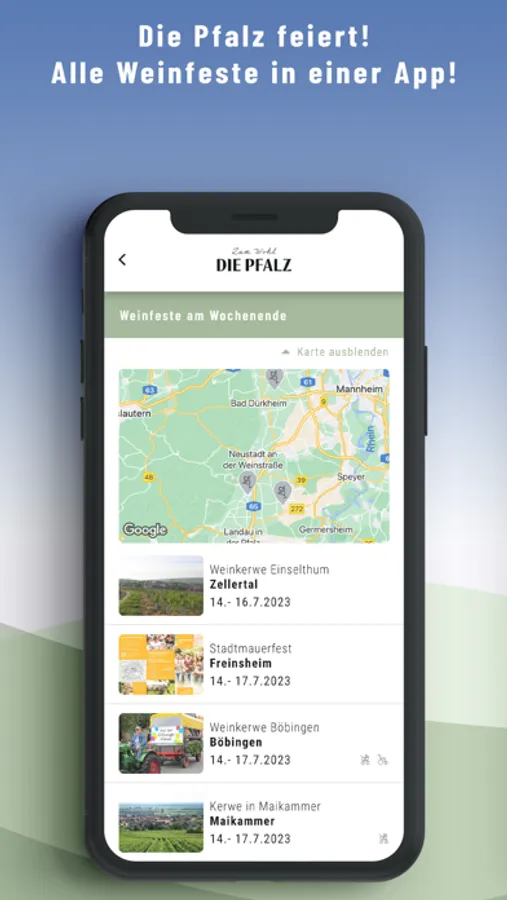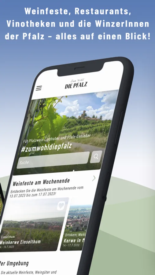Wer die Pfalz und den Pfälzer Wein liebt, der liebt auch die neue „Zum Wohl die Pfalz“-App. Die neue Anwendung der Pfälzer Weinwerbung im Design der Marke #zumwohdiepfalz präsentiert Weingüter und Genossenschaften, Vinotheken und Gastronomiebetriebe und natürlich das Herzstück der Pfälzer Feierkultur – die Pfälzer Weinfeste.