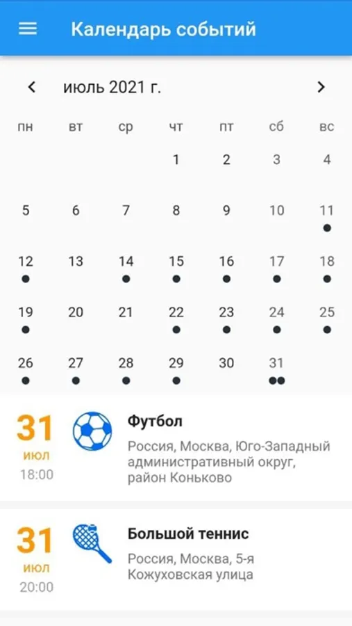 Календарь спортивных событий.