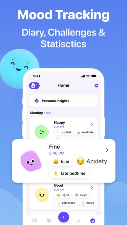Blobs Mood Tracker allows you to take control of your emotions, identify and understand them. The fundamental principle of the app is your constant desire to understand yourself, reflect on your own emotions and events that influenced them, draw conclusions and work them out to improve your life.
