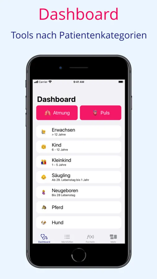 Zu jedem Patientenalter werden die Standardwerte, sowie Tools zur Erhebung von Vitalparametern bereitgestellt. Mit einfachen Taps auf den Bildschirm oder auf der Apple Watch lässt sich schnell und einfach die Atem- oder Pulsfrequenz erheben. Genauso schnell und effizient kann man die Glasgow-Coma-Scale für Patienten erheben. Bei Neugeborenen lässt sich schnell und einfach der APGAR Score erheben, sodass dieser zuverlässig dokumentiert werden kann.