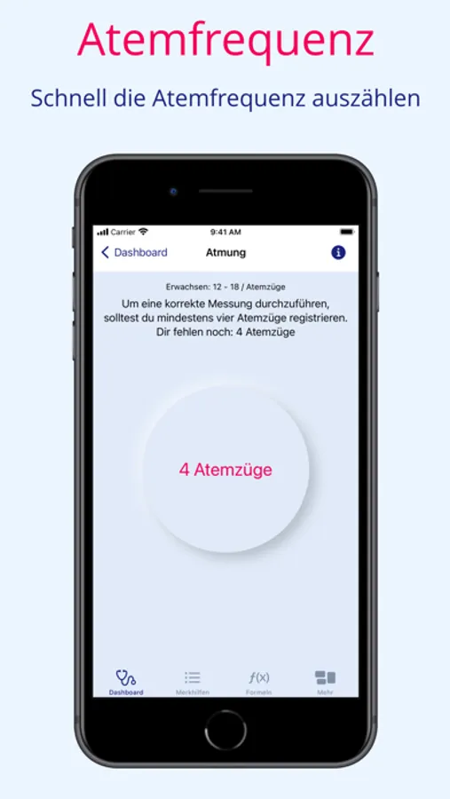 Mit dieser App ist es erstmals möglich die Herzfrequenz, sowie die Atemfrequenz auszuzählen. Die App kalkuliert automatisch die Frequenz anhand der Schläge und rechnete diese pro Minute hoch. Zudem kann der qSofa-Score, der APGAR-Score und die GCS erhoben werden. In den Merkhilfen ist der ABCDE, SAMPLERS und OPQRST, IPAPF, ATMIST, ISBAR, WOLKE, MELDEN, BASICS, PECH, und die 4Hs&HITS, sowie BE-FAST und weitere enthalten. Sauerstoffrecher, PY-Rechner, Perfusor Dosierungsrechner, Neunerregel, mittlerer Arterielle Blutdruck Rechner, sowie die Baxter-Parkland und die Brooke-Formel sind in der Formelsammlung enthalten und helfen dabei einen kühlen Kopf zu bewahren. Ein interaktives EKG-Lagetyptool erleichtert das feststellen des Lagetyps im EKG.