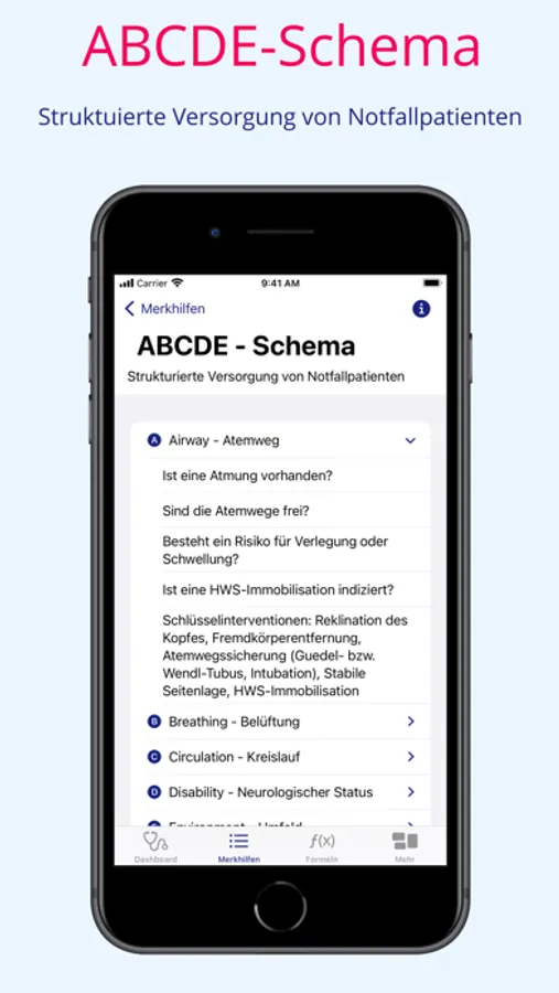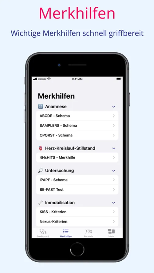 Im Bereich Merkhilfen sind eine Vielzahl von Merkhilfen, wie das gängige ABCDE oder das SAMPLERS Schema hinterlegt. Ebenfalls ist der qSofa Score und die Nexus Kriterien zum schnellen Nachschlagen eingearbeitet.