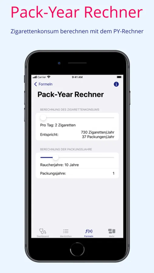 In der Formelsammlung sind neben den Verbrennungsformeln auch der Pack-Year Rechner, sowie ein Sauerstoffrechner hinterlegt.