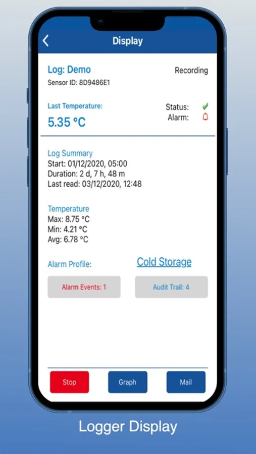 AntTail temperature sensors are read out and controlled via the display in the AntLogger app. AntTail sensors always measure temperature and store the data in their internal memory with a five-minute interval and use a Bluetooth protocol to synchronize measurements. While a user checks the temperature and alarm status on the AntLogger app display, automatically, the app reads the sensor data wirelessly and sends all encrypted sensor data directly to the AntCloud. This ensures that all data is stored in the AntCloud when a AntLogger app is used to inspect and configure a temperature logger and that an audit trail is available. For the app user the advantage is that he/she does not have to take manual actions to upload the data or temperature report.