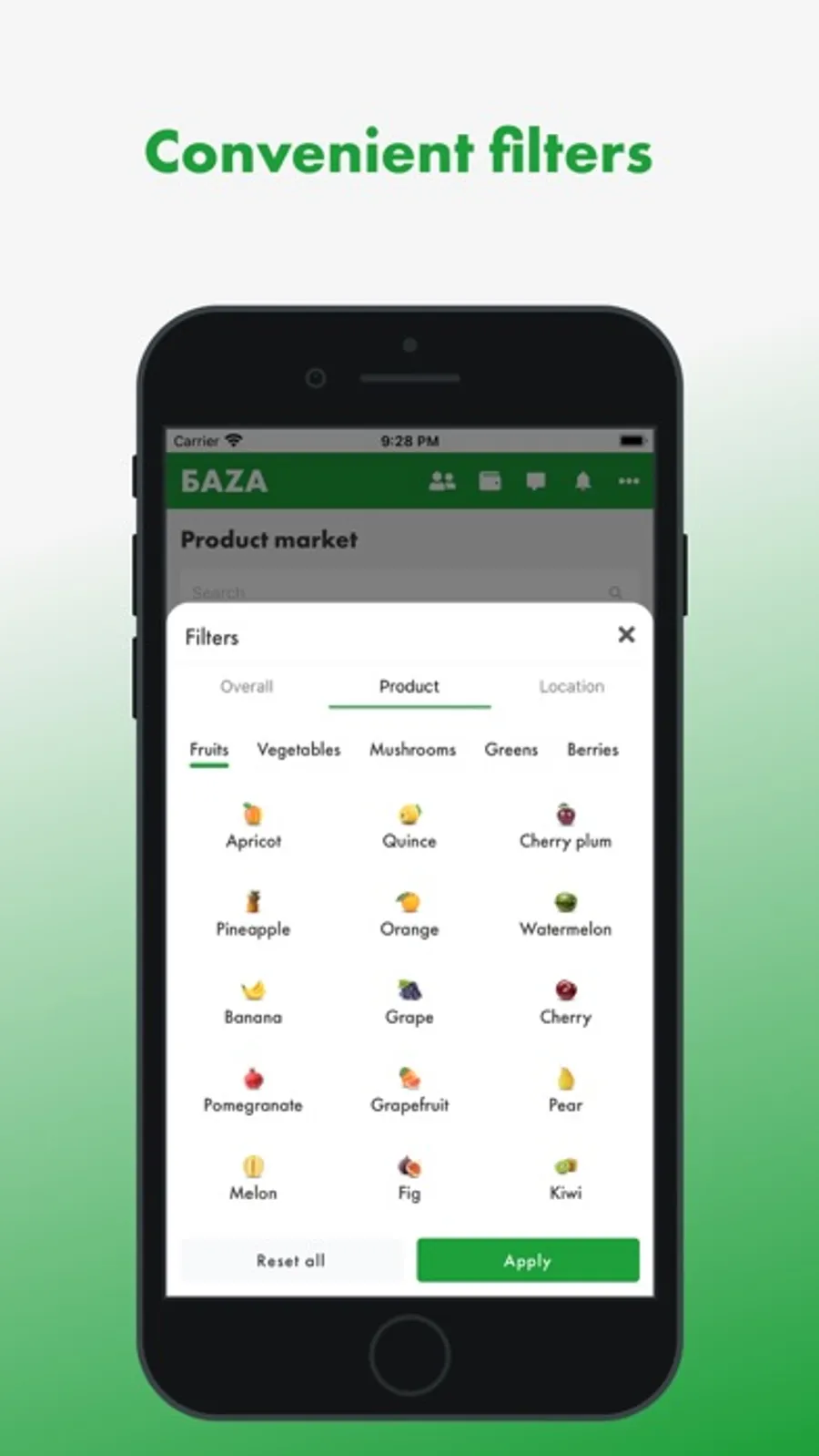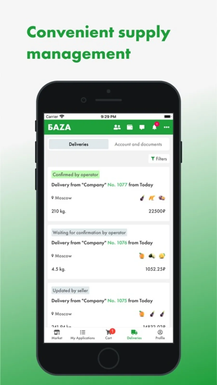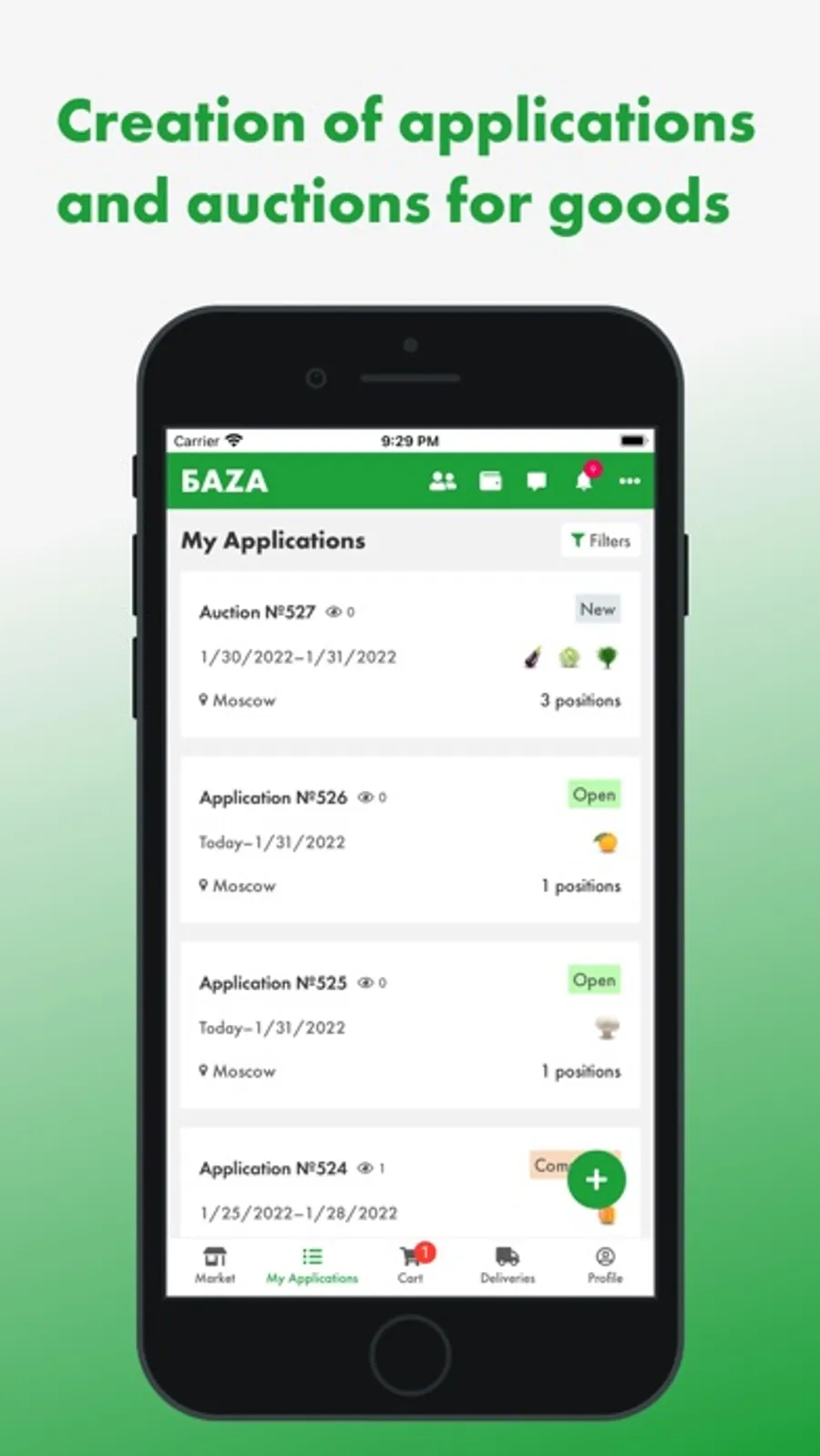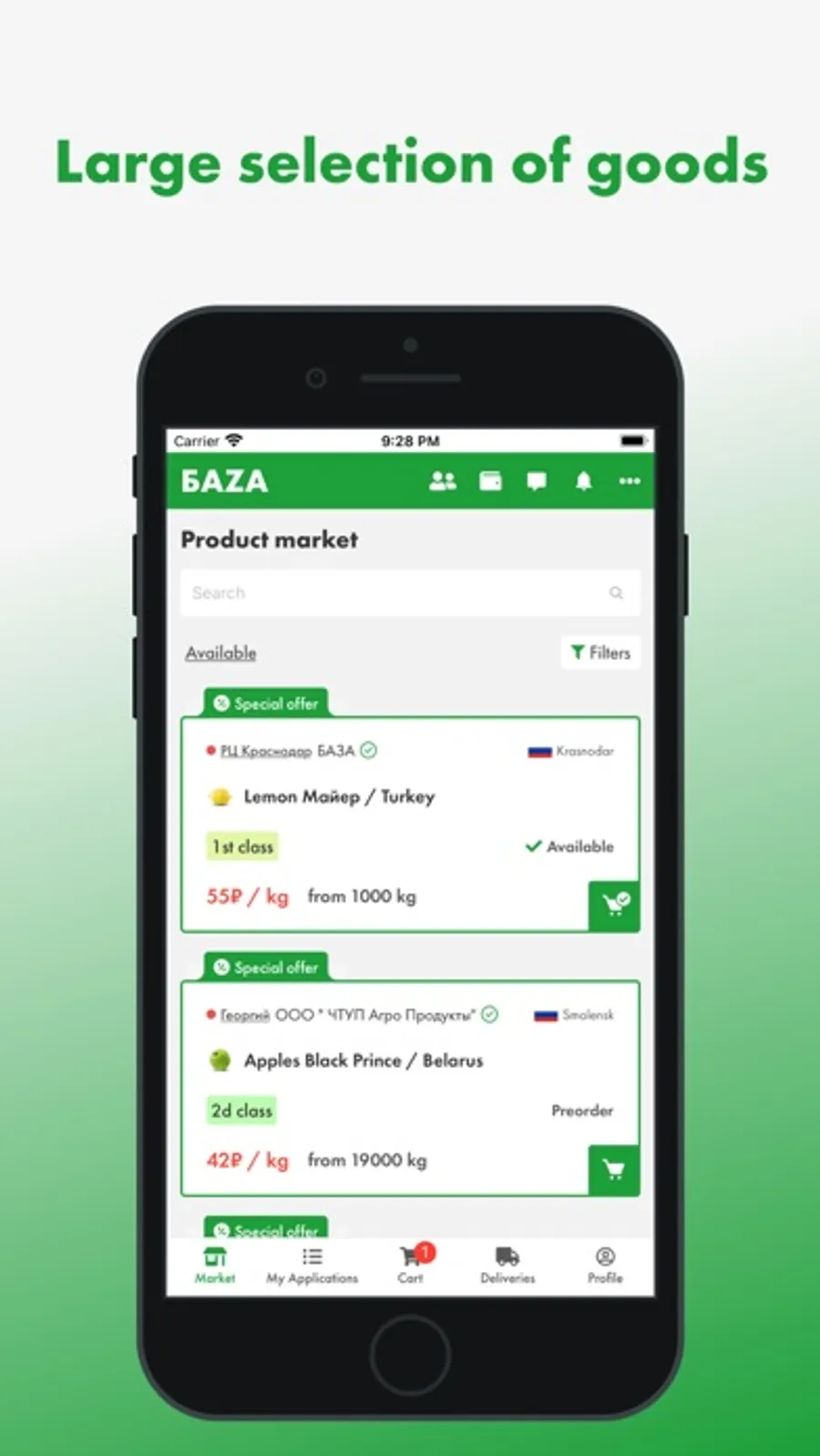 The first wholesale online market for fresh fruits and vegetables in Russia, where a lot of products from farmers and exporters is presented, ready for supply from BAZA Distribution Centers in Moscow and St. Petersburg cities.