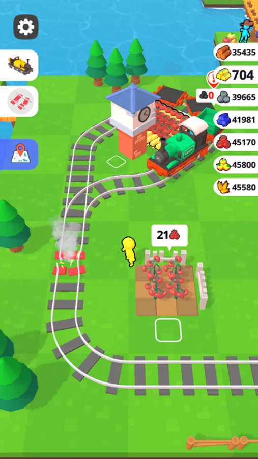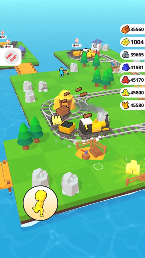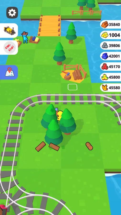 Get gold and stones, chop trees, send your idle train from the platform and expand your lands!