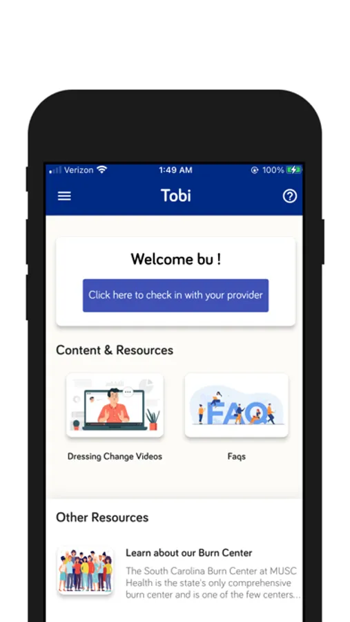 Tobi app offers specialized burn treatment for patients. Burn care often relies on repeated burn dressing changes during the first 10-14 days with frequent evaluation by burn nurses and physicians. Unfortunately, many parents do not adhere to the daily dressing protocol and/or don't have healthcare providers to monitor the process. Many families have to travel from many miles away for burn care. The TeleBurn app makes it easier by connecting patients and families with expert burn nurses and physicians.