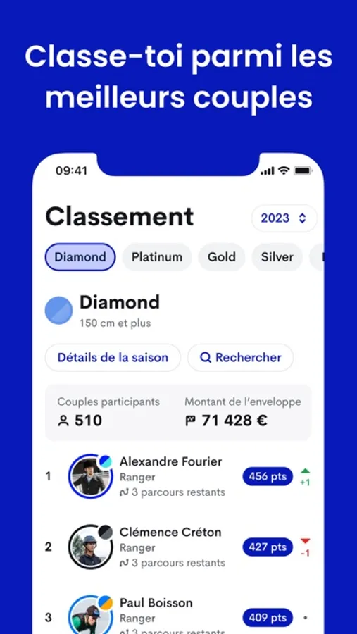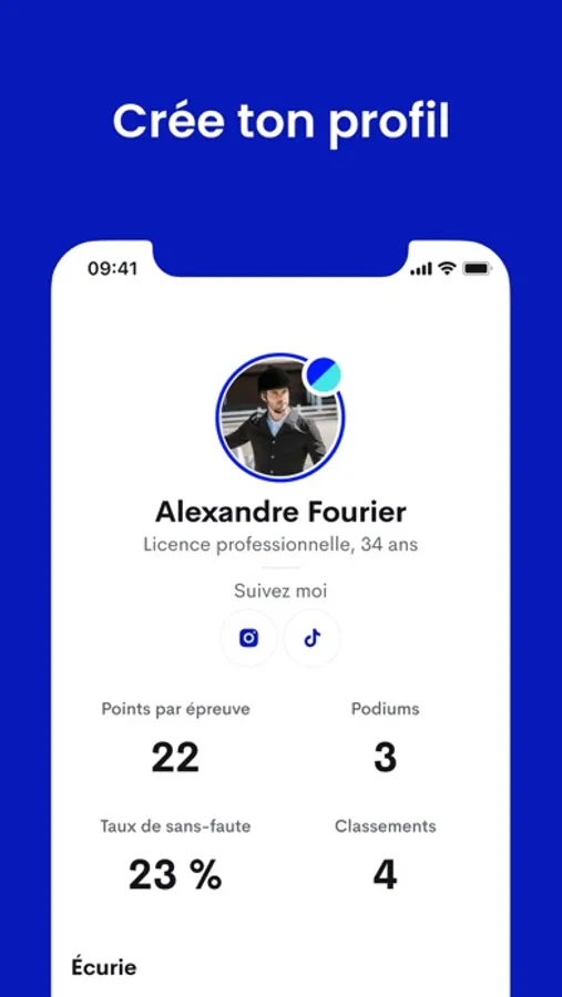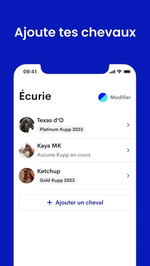 Créez votre profil et votre écurie. Kupp™ fonctionne par couple : pour participer et marquer des points, il faut que le même cavalier monte le même cheval sur toute la saison.