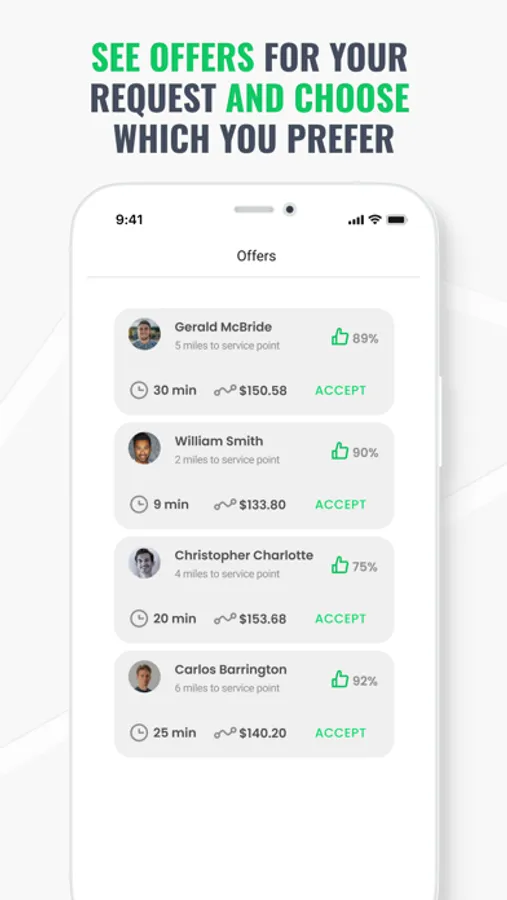 Whether it is urgent or planned maintenance, you can do it all on the app. Send a request for tires, towing, or service and watch it unfold. See the offers to your request come in and choose which you prefer.