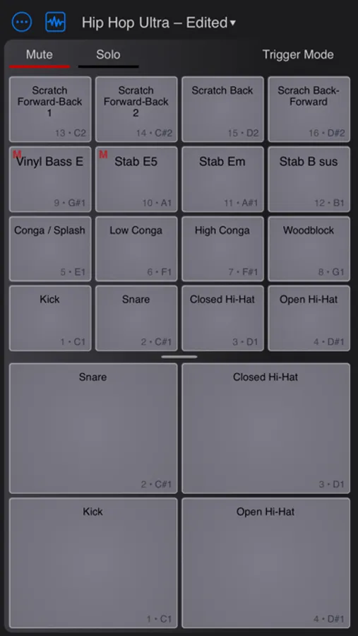 • 16 drum pads, each of which can play a user-assigned sample
