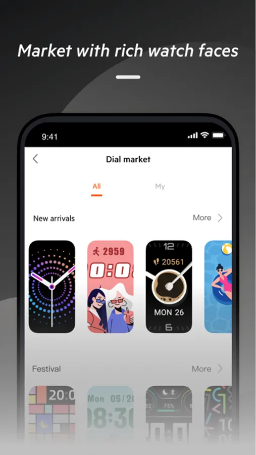 [Change Dial]: A rich selection of watch face themes are available in the brand-new cloud dial market, giving your device a new look every day;