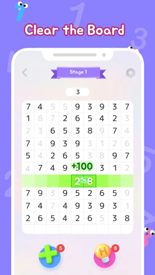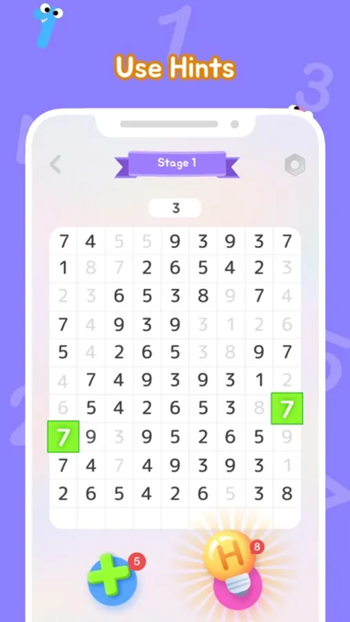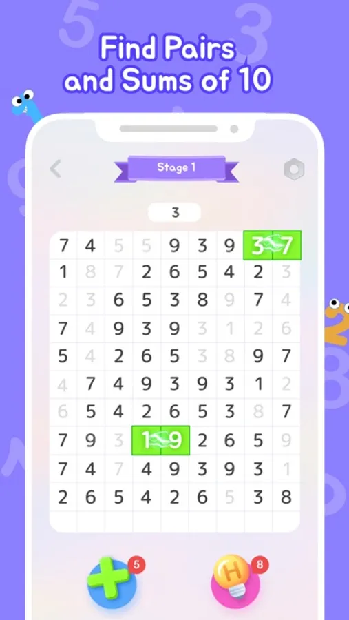 • Solve the logic puzzle! Find different pairs of various numbers to clear the number grid at the end.
